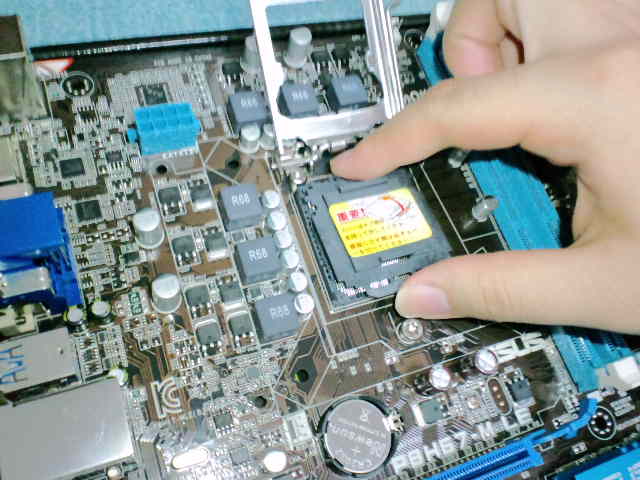マザーボードのCPUソケットを開ける。写真の位置を押し込みながらずらすだけだ。